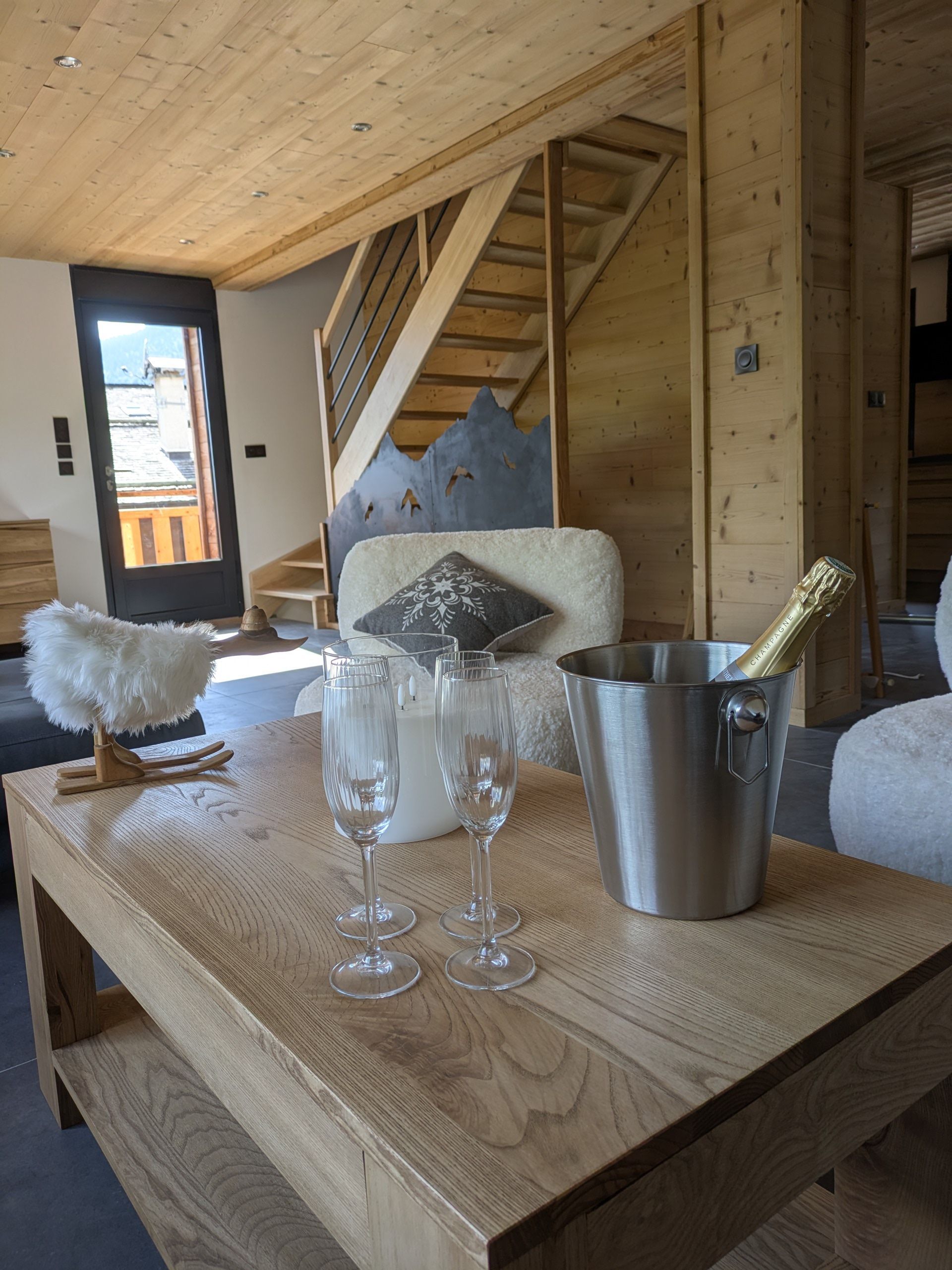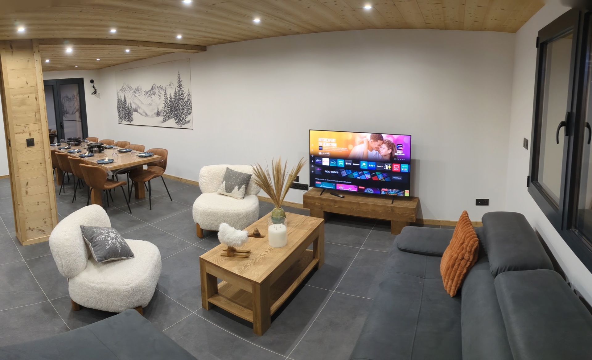 This welcoming layout allows you to cook while enjoying the ambiance of the beautiful adjacent living room. This bright space is the heart of the chalet, perfect for relaxation, shared meals, and memorable evenings. It offers direct access to the south-facing wooden terrace with views of the Aravis mountain range.